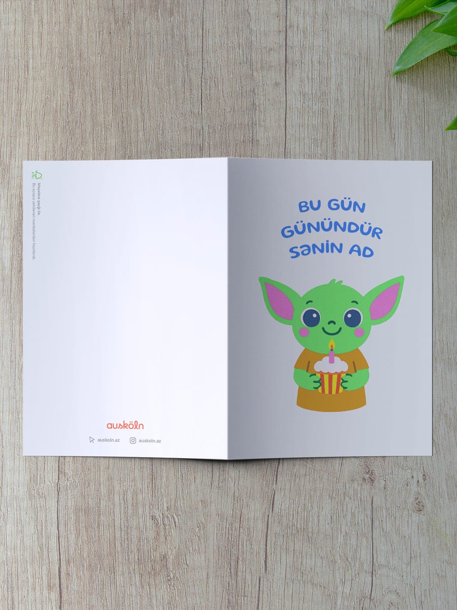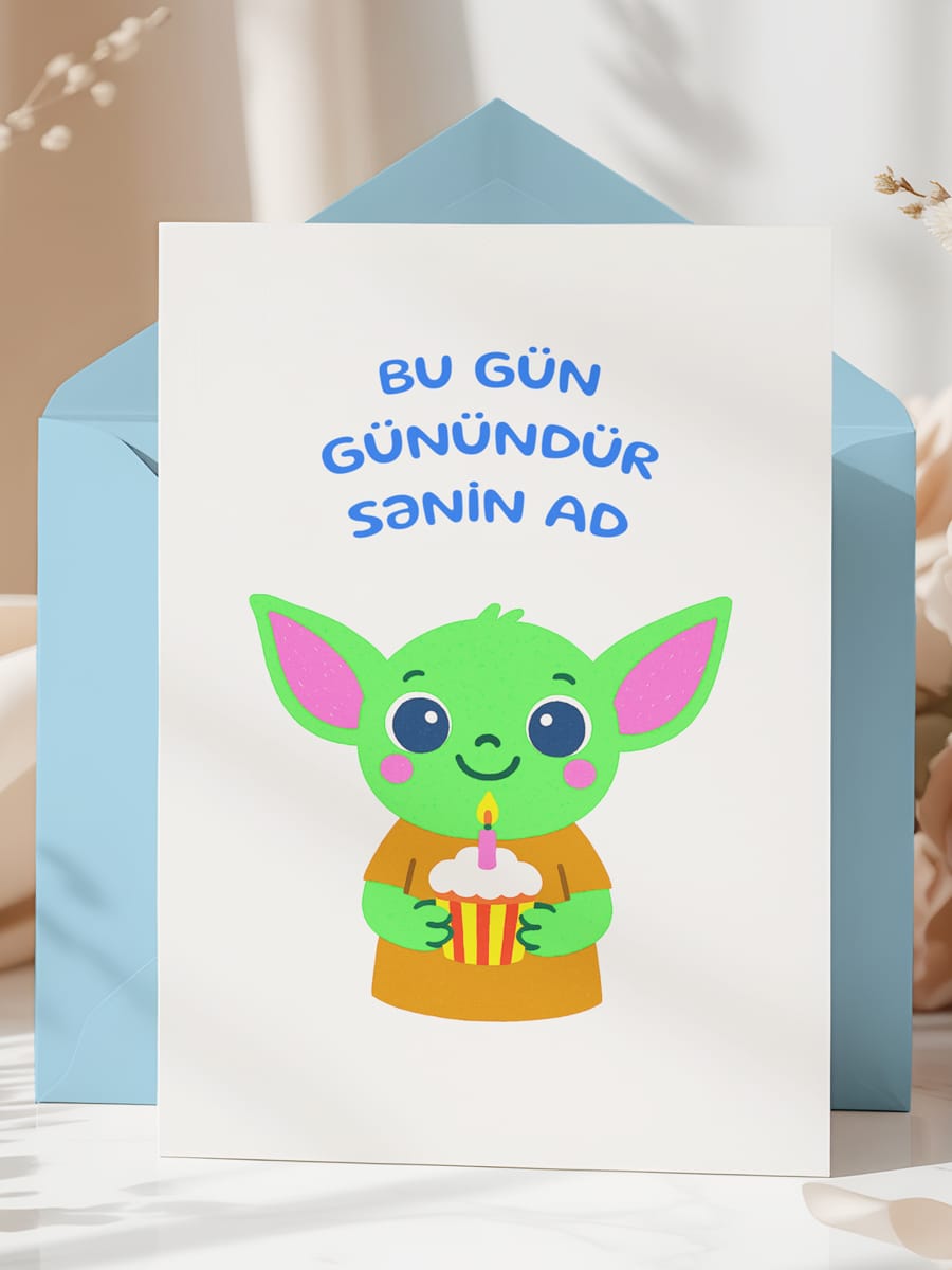 Əyləncəli, şirin və unudulmaz — bu açıqca doğum günü təbriklərini sevimli şəkildə çatdırır. Yaşıl balaca fiqur əlində şamlı cupcake tutaraq sanki deyir: “Bu gün günündür sənin ad!” Parlaq rənglər və uşaq kimi saf ifadə kartı həm böyüklər, həm də uşaqlar üçün əyləncəli və sevinc dolu edir.