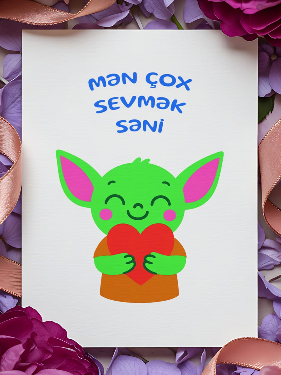 Sevimli, rəngarəng və ürəkdən gələn! Bu açıqca uşaq kimi saf hissləri ifadə edir. Əlində ürək tutan gülərüz yaşıl fiqur sanki demək istəyir: “səni çox sevirəm!” İstər sevgilinə, istər dostuna, istər ailə üzvünə ver — bu açıqca hər kəsi gülümsədəcək və içi istiliklə dolacaq.