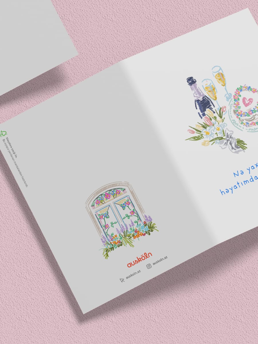 Romantik, zərif və səmimi — bu açıqca sevginin ən gözəl sözlərlə ifadəsidir. Şampan, çiçəklər və ürək formalı tortun yer aldığı illüstrasiya birgə anların şirinliyini xatırladır. “Nə yaxşı ki, həyatımda sən varsan” cümləsi isə həmin hissləri sadə, amma dərin bir şəkildə tamamlayır.