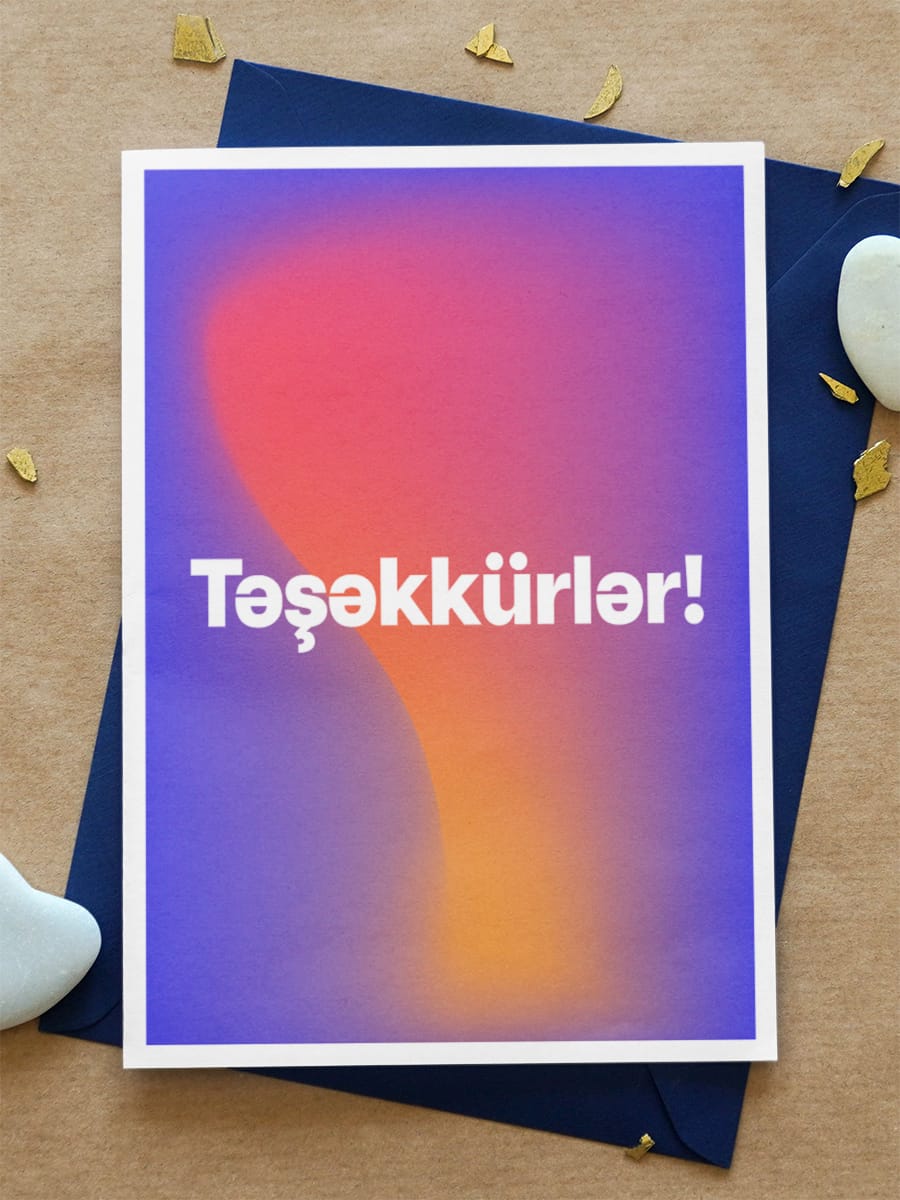 Rənglərin sakit harmoniyası və sadə dizaynı ilə bu açıqca minnətdarlıq hissini təbii və səmimi şəkildə ifadə edir. “Təşəkkürlər!” sözü parlaq fon üzərində diqqət mərkəzində dayanır, sanki bir anlıq xoş enerji və müsbət duyğular saçır.