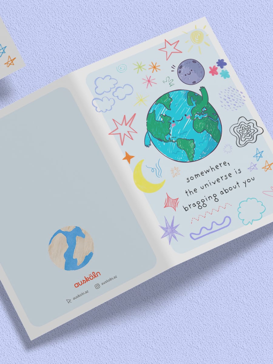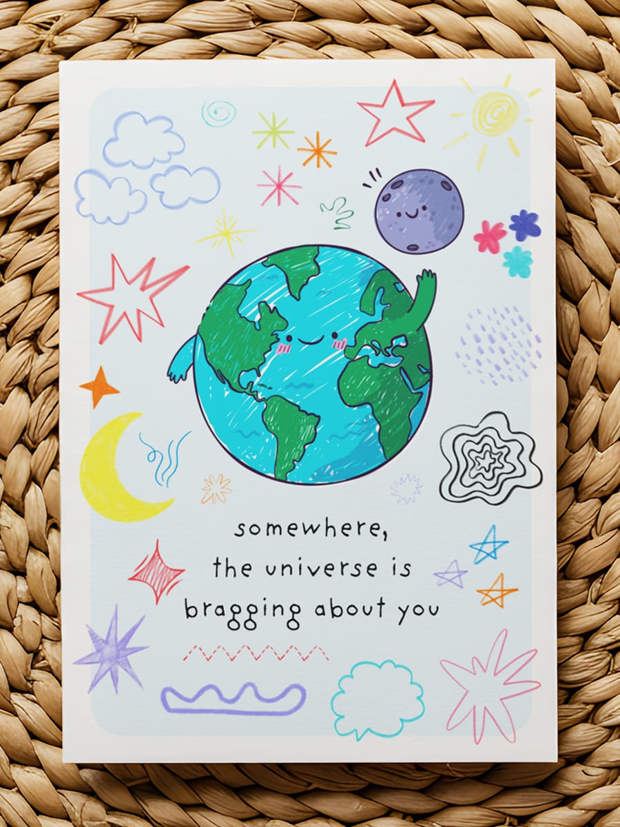Combining childhood dreams and the magic of space, this card radiates positivity and warmth. The smiling Earth against a backdrop of colorful stars, the moon, and clouds seems to say: “Somewhere, the universe is bragging about you.” With its cheerful energy and sincere design, this card will brighten up any moment.